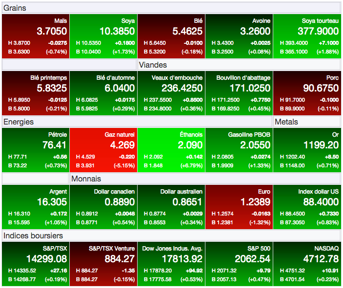 À l’opposé, les ventes américaines à l’exportation de soya rapporté hier par le USDA auront par contre déçu à seulement 483 000 tonnes, alors que c’est plutôt de 600 000 à 1 120 000 tonnes qui étaient attendues. N’empêche, il ne faut actuellement que des ventes de 234 000 tonnes par semaine pour atteindre le total d’exportation prévu par le USDA de 43,18 millions de tonnes pour 2014-15.