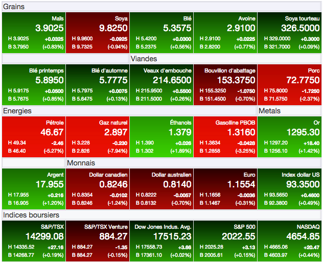 Heureusement, le dernier rapport hebdomadaire sur les inspections des exportations américaines grains présenté aujourd’hui aura donné un répit au marché du soya. Selon ce rapport, elles ont été la semaine dernière pour le soya de 1,518 millions de tonnes, ce qui est plus que ce qu’anticipaient les marchés (1,25 à 1,50 million de tonnes). Du côté du maïs également, le rapport aura été intéressant, proposant des inspections de 747 643 tonnes, un résultat dans les attentes les plus élevées des marchés (550 000 à 750 000 tonnes). Comme toujours, seules les inspections à l’exportation de blé américain trainent toujours de la patte, s’établissant la semaine dernière à 310 255 tonnes, ce qui est dans les attentes des marchés (250 000 à 375 000 tonnes), mais sous le niveau nécessaire de 555 000 tonnes par semaine pour atteindre la prévision d’exportations totales que prévoit pour 2014-15 le USDA.