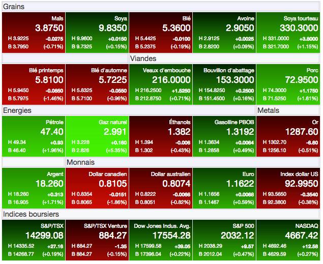 Côté soya, une nouvelle vente à la Chine de 176 000 tonnes a été confirmée aujourd’hui par le USDA. Ceci aura conforté les marchés qui commençaient à voir d’un mauvais œil les deux annulations importantes annoncées depuis jeudi dernier (285 000 tonnes et 174 000 tonnes). Par contre, les incertitudes entourant les conditions sèches observées dans certaines régions du Brésil s’estompent, des averses étant actuellement encours dans plusieurs d’entre elles. La partie n’est toujours pas jouée pour les récoltes sud-américaines, mais plus les semaines passent, plus leur importance se confirme.