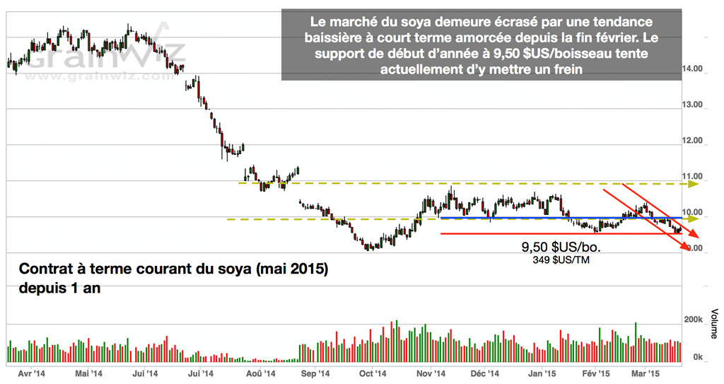 Semaine qui n’aura pas été de tout repos dans le marché des grains. À Chicago, le marché du soya a atteint un nouveau creux inégalé depuis l’automne dernier, le maïs se transige pour une deuxième fois depuis le début de 2015 à son plus bas, seul le blé garde le cap, bien qu’il soit confronté maintenant à une bonne résistance à l’approche de 5,20 $US/boisseau.