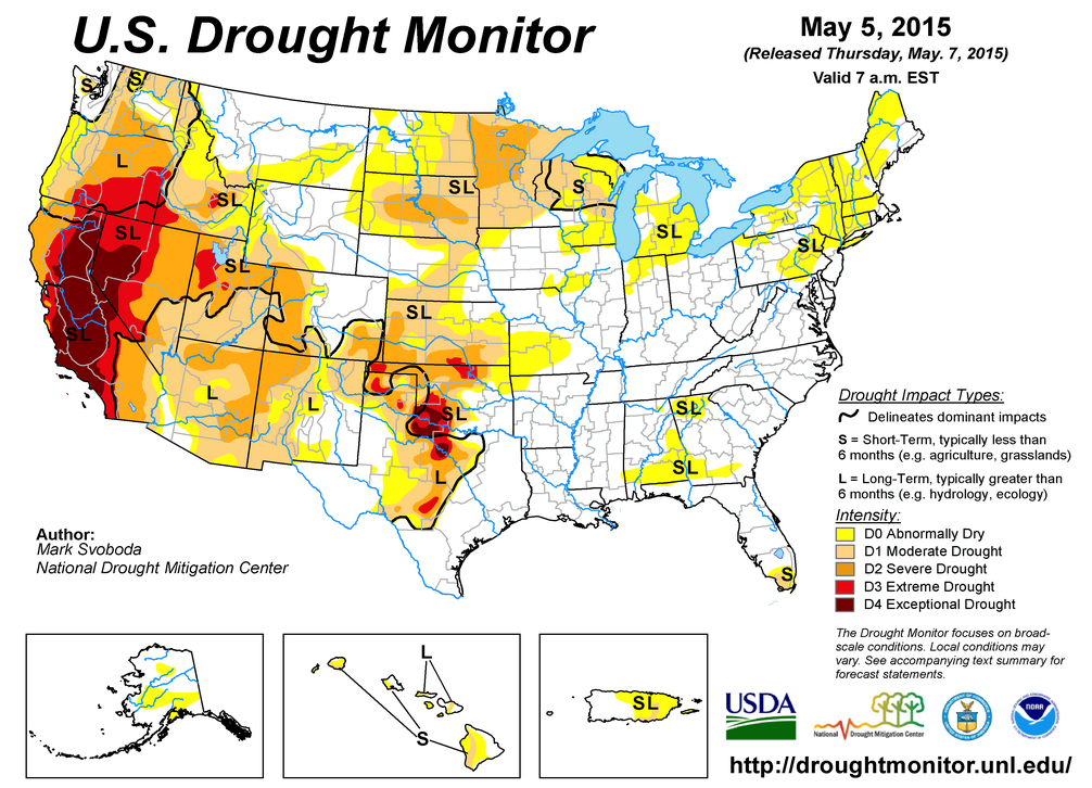 Brève mention, comme l’illustre la carte ci-haut, il faut noter que malgré des averses observées récemment dans plusieurs régions de l’ouest et du nord des Plaines et du Midwest américains, les conditions de sècheresse aux États-Unis font toujours état de région très asséchée.