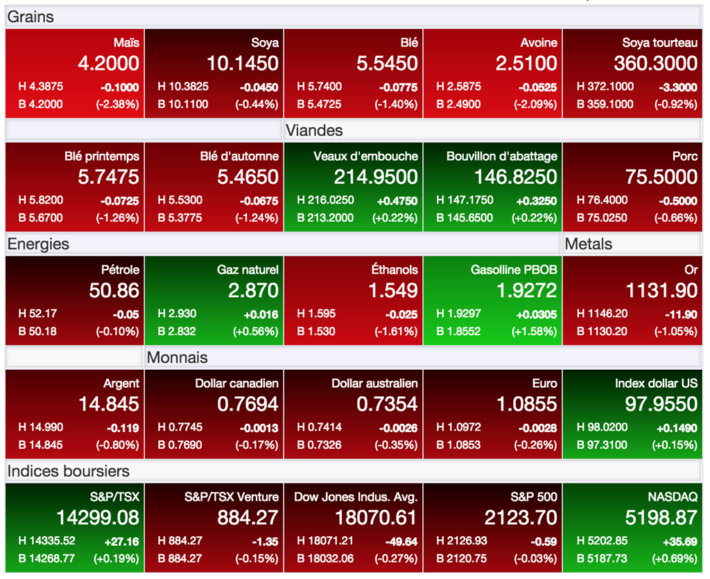Pour la prochaine récolte à Chicago : le maïs -0,1375 à 4,3125 $US/boisseau, le soya -0,16 à 10,0625 $US/boisseau, et le blé -0,2150 à 5,5450 $US/boisseau.