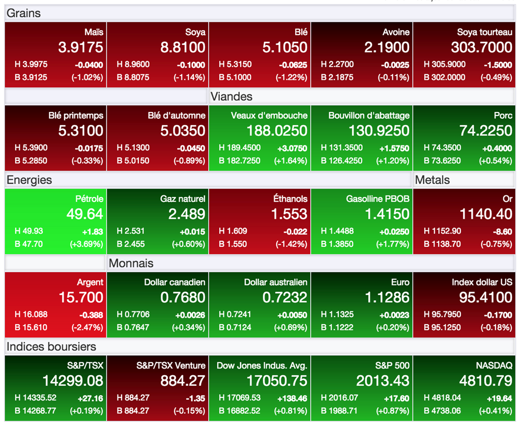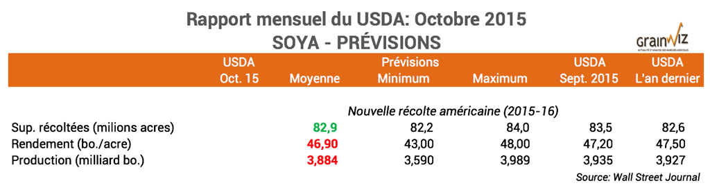 Techniquement, le recul des prix d’aujourd’hui laisse les prix des grains à Chicago dans une position fragile. Autant le marché du maïs que celui du blé se sont appuyés de justesse sur leur support de tendance haussière des dernières semaines. Tous deux ont également tenté dans les derniers jours sans succès de franchir des résistances clés (maïs 4,00 $US/boisseau CàT Décembre 15 et Blé 5,33 $US/boisseau CàT Décembre 15), comme quoi il manque encore un dernier incitatif pour les propulser à la hausse davantage, ce que le USDA pourrait permettre (ou non) avec son rapport mensuel de demain. De son côté, le marché du soya à Chicago reste éternellement confiné dans sa tendance neutre, avec de fortes résistances à l’approche de 8,95-9,00 $US/boisseau (CàT Novembre 15), le rapport du USDA se révélant ici aussi déterminant pour la suite des choses.