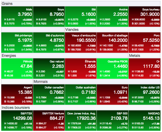 Suivant une progression très intéressante la semaine dernière, et avec l’approche de résistance plus importante (5,22 $US/bo. sur décembre 15), les marchés ont donc décidé de prendre un peu de recul hier, pour se raviser en partie aujourd’hui. La tendance haussière amorcée à la mi-octobre reste effective, mais il faut rester prudent avec de bonnes résistances en vues.
