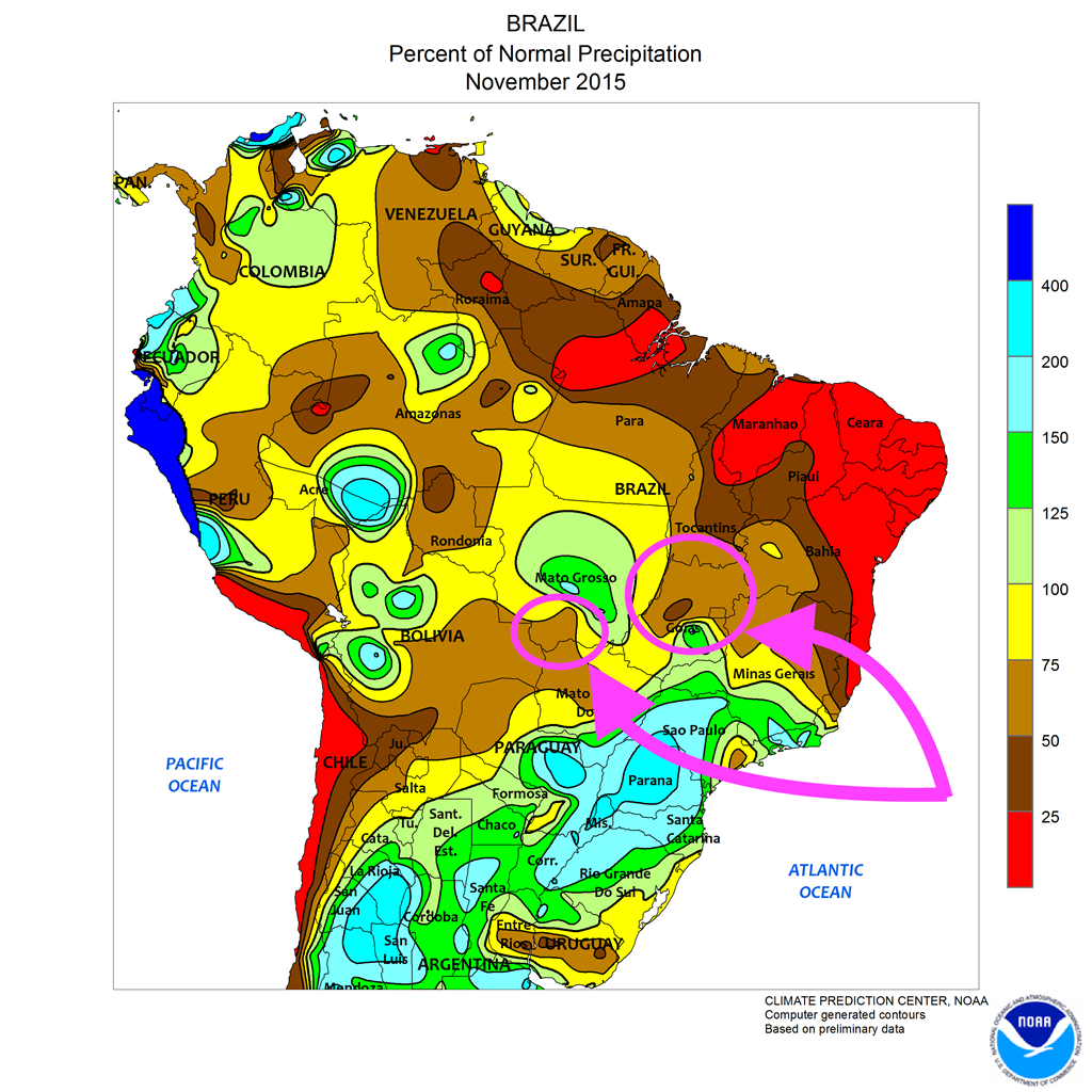 De fait, la dernière semaine a réitéré le risque que certaines régions du Brésil n’obtiennent pas les récoltes escomptées. En raison du temps sec qui persiste, IMEA (l’institut agricole de la région de Mato Grosso) prévoit une récolte de l’ordre de 1 million de tonnes moins importante que prévu. Selon le dernier rapport sur l’état des cultures, ce serait 30% d’elles qui seraient dans un mauvais état présentement.