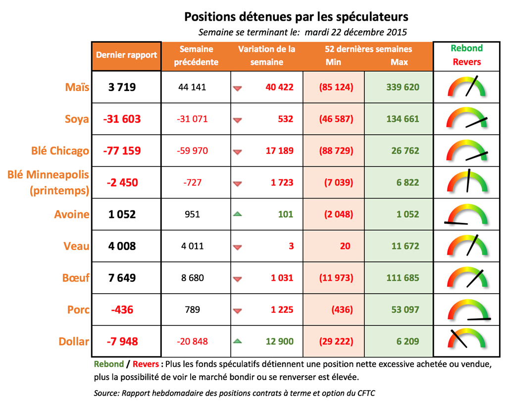 Dollar Canadien : Il faut s'attendre à un bon rebond en raison de températures froides et la hausse de la consommation d'essence et d'huile à chauffage. Le positionnement des spéculateurs était tellement vendeurs que les fonds devront couvrir avant le début de l'année 2016. Un rebond autour de 73 cents USD est donc envisageable.