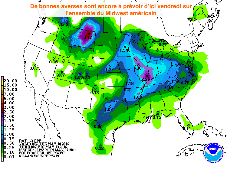 Côté météo, la prochaine semaine restera difficile pour la progression des ensemencements américains. De très bonnes précipitations sont encore attendues dans les prochains jours avec, pour la semaine prochaine, des précipitations encore éparses sur le radar.