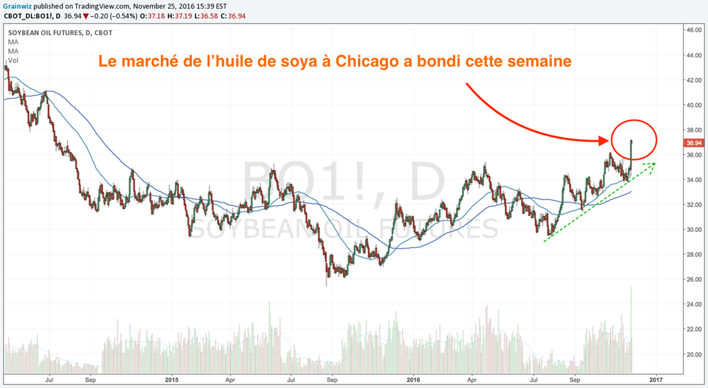 Cette fermeté de la demande à l’exportation offre un bon support au niveau actuel des prix, spécialement du côté du soya bien entendu. Par contre, c’est le rallye important du marché de l’huile de soya, supporté par les mauvaises récoltes d’huile de palme en Asie, qui aura sans aucun doute le plus profité au marché du soya lui-même dans la dernière semaine de l'avis de plusieurs analystes.