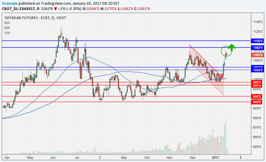 Sans surprise, le marché du soya à Chicago aura profité de l’occasion pour bondir pour députer la semaine, atteignant hier un sommet inégalé depuis juillet dernier à 10,7550 $US/boisseau sur son échéance immédiate (présentement Mars 17).
