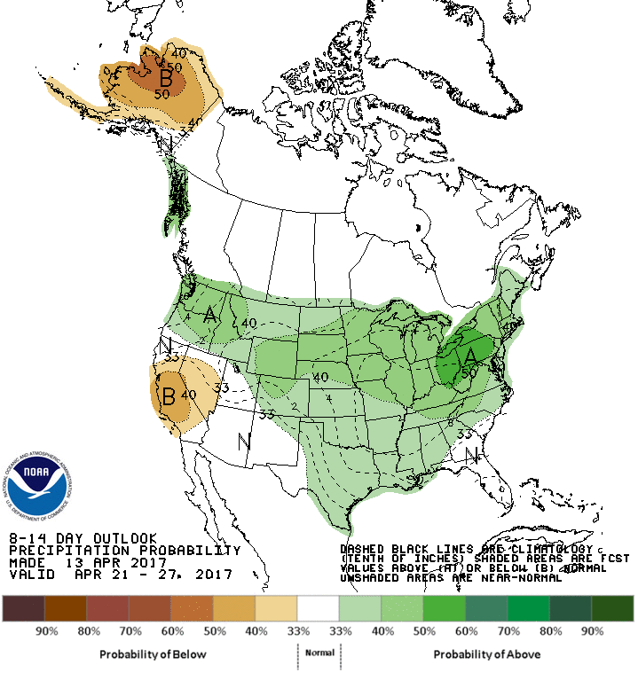 Dans tous les cas, le regain intéressant et prometteur des prix des grains des derniers jours tient pour beaucoup de la météo américaine présentement. Il faudra donc être très attentifs aux prévisions météo pour amorcer la prochaine semaine après trois jours de congé avec la fête de Pâques. Pour le moment, ce vendredi, les dernières prévisions météo proposent encore de bonnes précipitations pour les deux prochaines semaines.