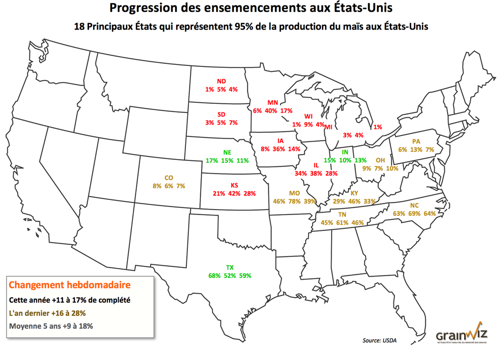 Maïs – 17% de semés, une progression de +11% par rapport à la semaine dernière. C’est un peu plus que les anticipations des marchés, 1% de moins qu’en moyenne depuis 5 ans, et nettement moins qu’à pareille date l’an dernier (30%).