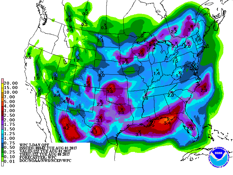 En d’autres mots, on parle donc de bonnes précipitations pour assurer le reste du développement des cultures américaines, et d’aucune menace de vague de chaleur excessive à l’horizon. Si certaines régions ne profiteront peut-être pas de précipitations suffisantes suivant les dernières semaines très chaudes et sèches, le temps plus frais prévu a le mérite d’atténuer également le stress hydrique que pourraient occasionner des chaleurs trop importantes.