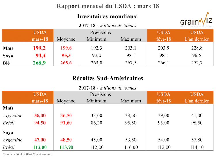 Le USDA a présenté ce midi son rapport mensuel d’offre et demande (WASDE) pour le mois de mars 18. Dans l’ensemble, les nouvelles prévisions proposées sont positives pour le maïs, neutres pour le soya et négatives pour le blé. Quelques points à retenir :