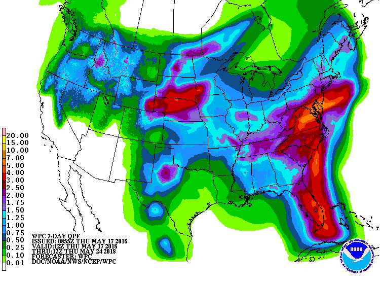 Aux États-Unis, dans le sud des Plaines, des précipitations sont attendues, mais apparaissent insuffisantes et incertaines pour les prochains jours. On rapporte aussi de la grêle et de forts vent qui pourraient avoir endommagés les cultures au Kansas. Plus au nord, les conditions plus humides pourraient de nouveau ralentir la fin des ensemencements, bien qu’on rapporte que certains producteurs devraient les avoir maintenant complétés.