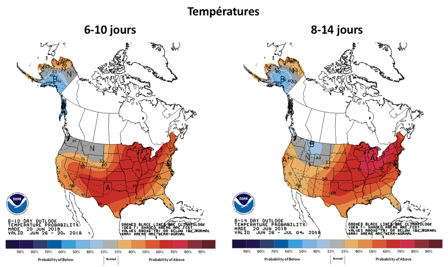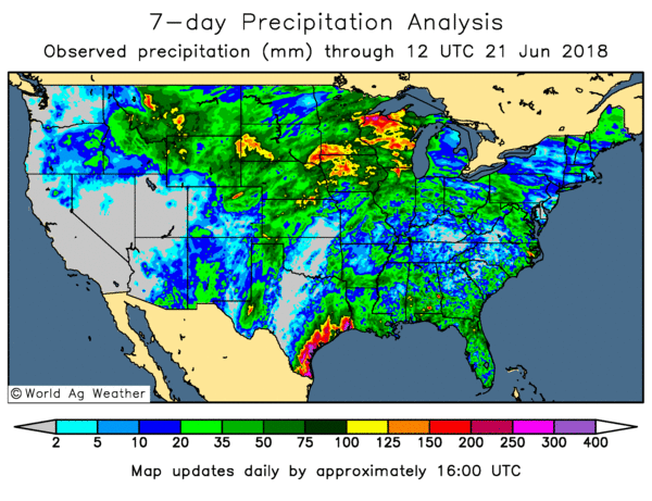 Côté météo, les prévisions actuelles se suivent et se ressemblent pour le Midwest et les Plaines américaines avec des précipitations régulières prévues encore pour les 2 prochaines semaines, et des températures anormalement chaudes qui devraient persister jusqu’au début juillet.