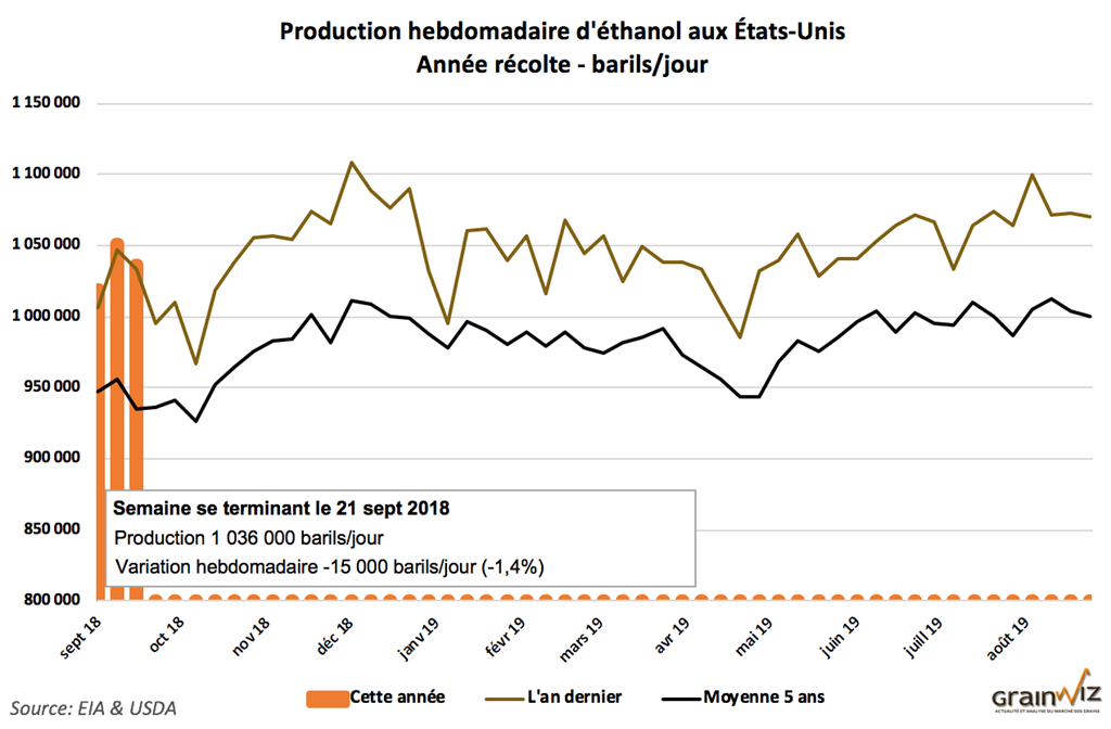 Ce matin, l’EIA a rapporté que dans la semaine du 21 septembre dernier, la production d’éthanol US a été de 1,036 million de barils par jour. Ce serait une baisse de 15 000 bpj comparativement à la semaine précédente. Les inventaires d’éthanol ont, quant à eux, baissé de 117 000 barils à 22,629 millions de barils. La Côte Est des États-Unis fut la seule région avec une hausse a été observée.
