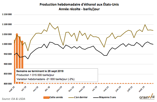 Le rapport hebdomadaire de la EIA sur l’éthanol américain a montré ce matin que durant la semaine du 28 septembre dernier, la production a été de 1,015 million de barils par jour, ce qui représentait une baisse de 21 000 bpj. par rapport à la semaine précédente. C’était aussi le plus gros ralentissement depuis la mi-avril dernier. Les stocks d’éthanol ont augmenté de 816 000 barils à 23,445 millions de barils.