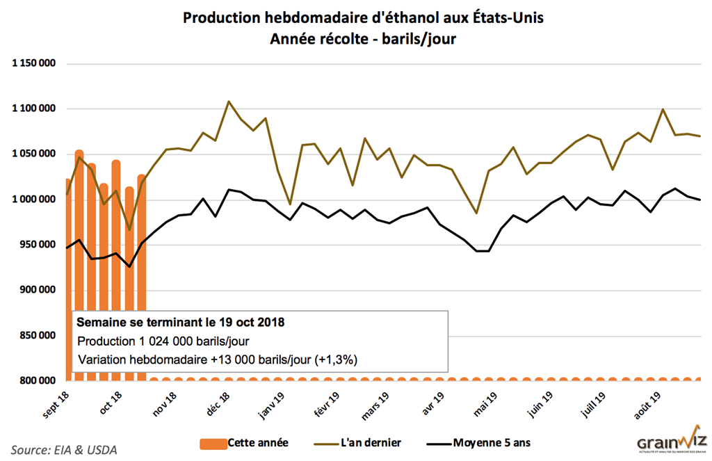 Le rapport hebdomadaire de l’EIA a indiqué ce matin que la production d’éthanol US a été de 1,024 million de barils par jour durant la semaine du 19 octobre dernier. Il s’agissait d’une augmentation de 13 000 bpj par rapport à la semaine précédente. Les inventaires d’éthanol US ont, quant à eux, baissé de 233 000 barils à 23,897 millions de barils. Que ce soit à l’est ou à l’ouest de la Côte Américaine de même que dans le Midwest, les stocks ont été revus à la baisse. Par contre, ils étaient en hausse de 403 000 barils dans la région du Golf.