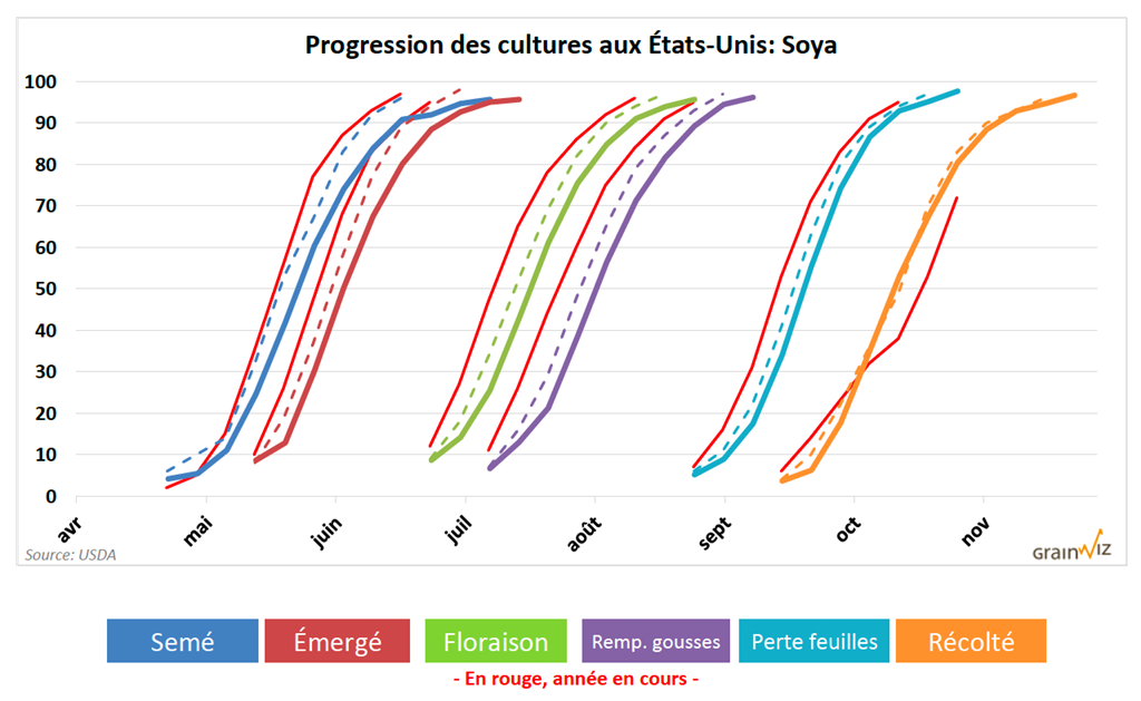 En date du 28 octobre dernier, la récolte de soya américain était complétée à 72 %, soit à un résultat inférieur au rythme normal de 9 %. Cependant, il s’agit d’une progression de 19 % comparativement à la semaine précédente. La majorité des États de l’Ouest du Corn Belt ont bien progressé. En Indiana, la récolte était finalisée à 31 %. Au Nebraska, c’était 20 %, au Minnesota 25 %, au Dakota du Sud 29 % et au Dakota du Nord 25 %.