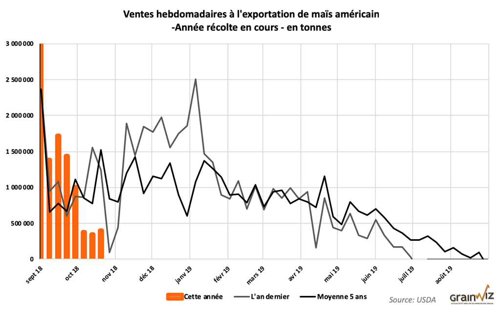 Pour la semaine du 25 octobre dernier, le USDA a indiqué que les ventes à l’exportation de maïs US ont été de 394,441 tonnes. Le résultat est inférieur aux attentes du marché. Il s’agit toutefois d’une augmentation de 12,85 % par rapport à la semaine précédente. Malheureusement, c’était également une baisse de 51,39 % comparativement à la même période l’an passé. Il y a eu des réductions notables avec le Vietnam (66 000 tonnes) et avec la Corée du Sud (62,800 tonnes). Du côté des acheteurs, le Mexique a été le plus important avec 192,200 tonnes.