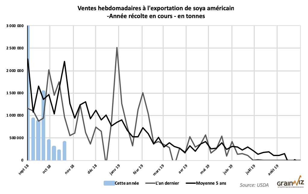 Par ailleurs, les ventes à l’exportation de soya US durant la semaine du 25 octobre dernier ont été de 395,807 tonnes pour la saison 2018/2019 et de 60 000 tonnes pour celle de 2019/2020. Les ventes totales ont ainsi plus que doublées par rapport à la semaine précédente. Cependant, elles sont inférieures de 76,2 % comparativement à la même période en 2017. Un total de 519 000 tonnes a été annulé pour des destinations inconnues mais dans la plupart des cas, les ventes auraient simplement changées de date. Concernant la Chine, il y aurait eu une nette réduction à 62,800 tonnes. Les ventes à l’exportations de tourteau ont été de 321,687 tonnes et celles de l’huile se sont chiffrées à 22,155 tonnes.