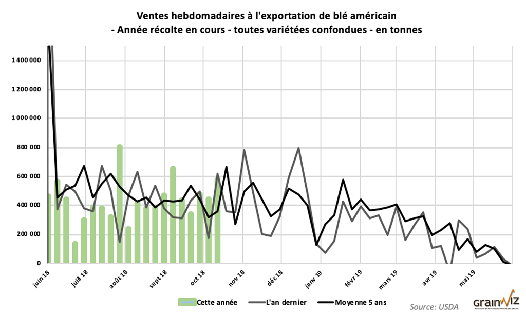 Pour la semaine du 25 octobre dernier, les ventes à l’exportation de tous les types de blé ont été de 582,545 tonnes. Ce serait le 3ème plus gros volume de l’année. Le résultat dépasse également les anticipations des marchés. Il s’agit en fait d’une hausse de 31,6 % par rapport à la semaine précédente et de 67,5 % comparativement à la même période l’an passé. Le Japon a été le plus gros acheteur avec 120,700 tonnes, suivi du Bangladesh, du Vietnam et du Venezuela qui a acquis 60 000 tonnes de blé US.