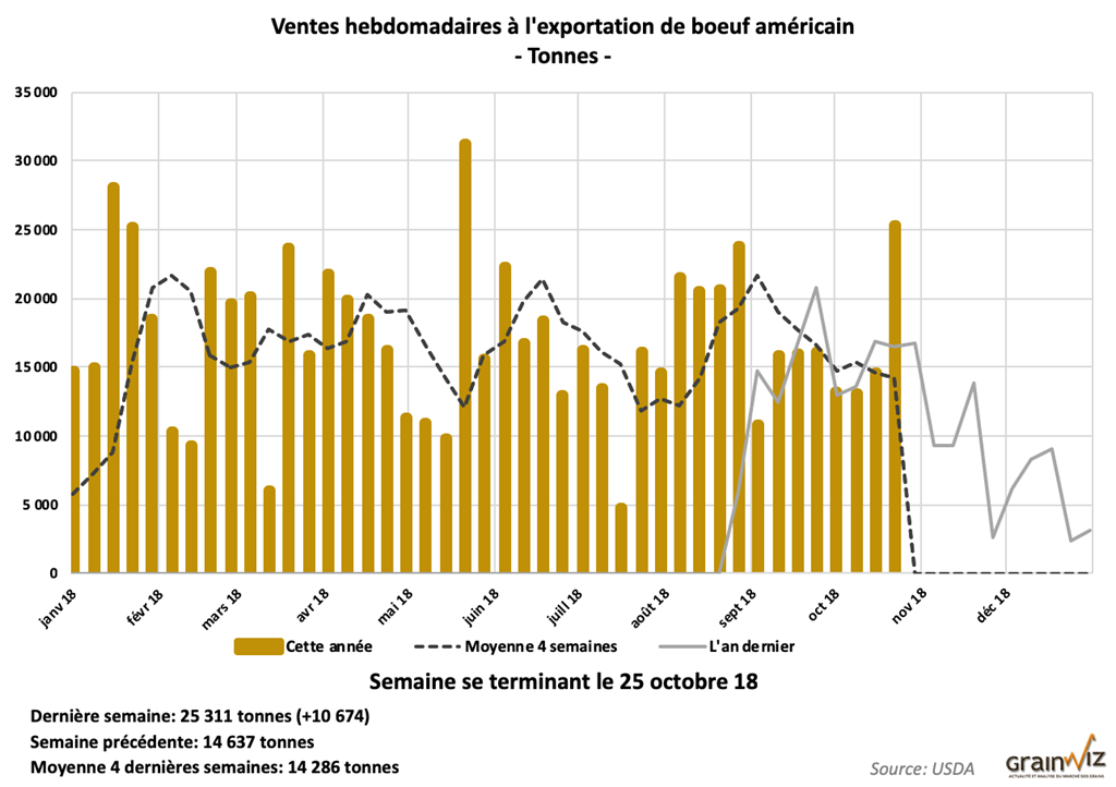 Pour la semaine du 25 octobre dernier, les ventes à l’exportation de bœufs US ont été de 25,311 tonnes. Ce serait le 3ème résultat le plus élevé de l’année.