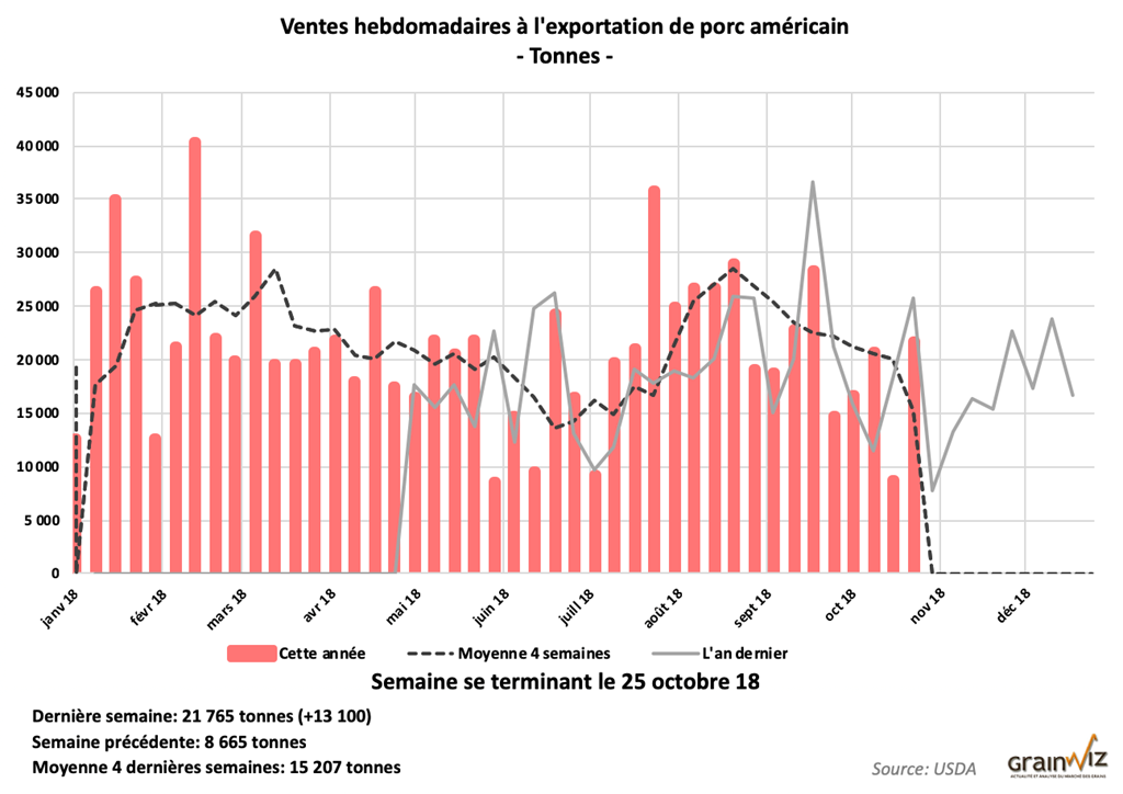 Pour la semaine du 25 octobre dernier, les ventes à l’exportation de porc ont été de 21,765 tonnes.