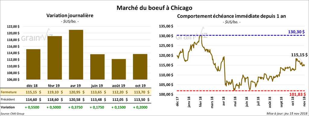 À la fermeture, la plupart des contrats de bœuf à Chicago avait gagné entre 15 et 55 cents. Les contrats de veau ont également terminé en hausse de 75 cents à 1 $. Le contrat novembre 18 a, quant à lui, expiré en baisse de 35 cents à 148,625 $