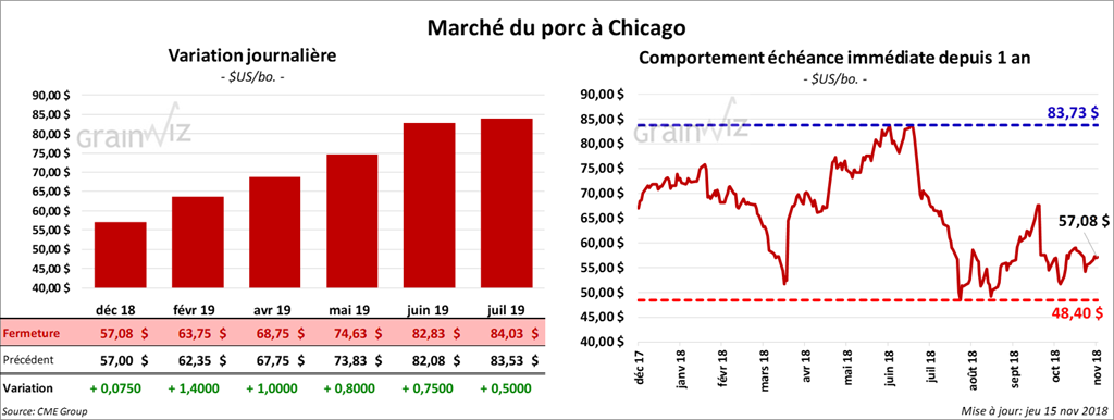 La majorité des contrats de porc à Chicago ont fini la session avec des gains de 50 cents à 1,40 $. Le contrat décembre 18 a progressé de 7,5 cents.