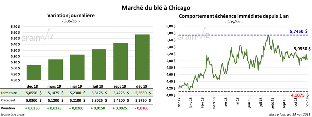 Ce jeudi, les contrats de blé à Kansas et à Minneapolis ont clôturé en baisse de 1 à 2 cents. Par contre, à Chicago, le SRW a été plus ferme, les échéances les plus rapprochées ayant fini au neutre à haussier de 2 ¾ cents.