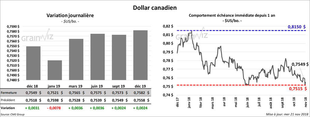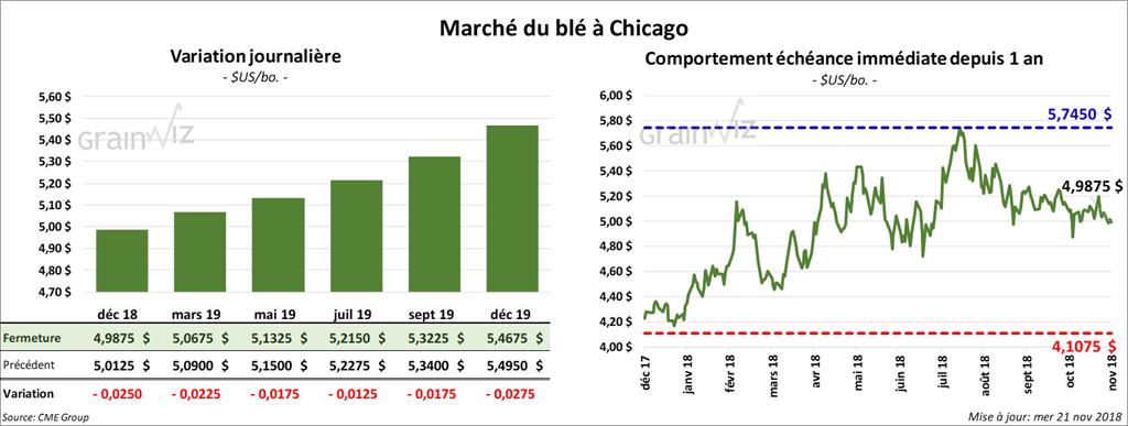 Hier, le marché de Dalian (Chine), a enregistré des baisses dans les contrats de soya qui ont d’ailleurs touché leurs plus bas niveaux. En Chine, tout indique qu’il y a une diminution importante dans la production de porc. Il y aurait aussi une planification réduite de l’expansion du cheptel porcin en raison notamment de l’épidémie de peste porcine africaine qui frappe actuellement le pays. Aujourd’hui, par contre, un léger rebondissement dans les contrats chinois de soya a été enregistré. Depuis son haut en avril dernier, le contrat de soya janvier 19, qui se transige au Dalian, a perdu 19 % de sa valeur et ce, malgré la baisse de la compétition américaine.