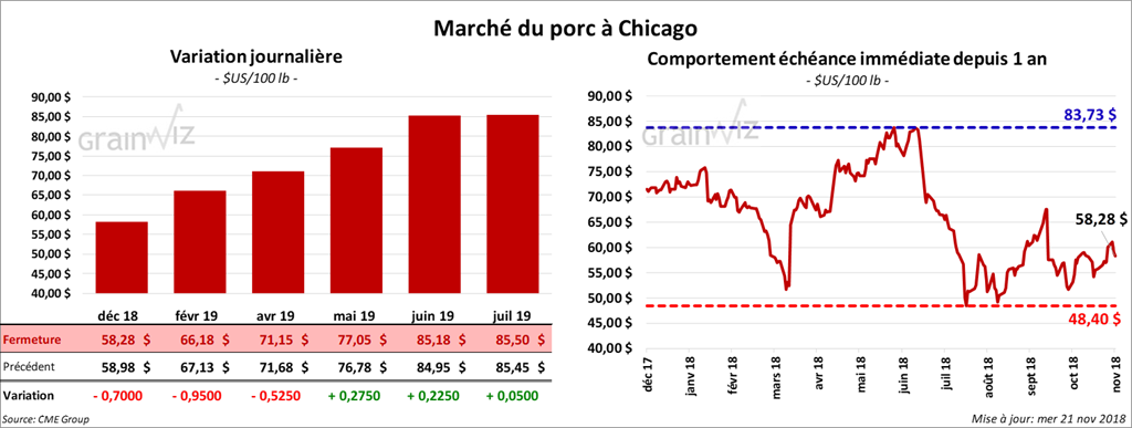 Le 19 novembre dernier, comparativement au jour précédent, le CME Lean Hog Index était en baisse de 28 cents à 58,23 $. Cet après-midi, la valeur moyenne des découpes de porc fut en hausse de 1,25 $ à 66,97 $. La découpe «picnic» était en hausse de 4,12 $. Sur une base nationale, le prix moyen au comptant était en recul de 61 cents à 50,76 $.