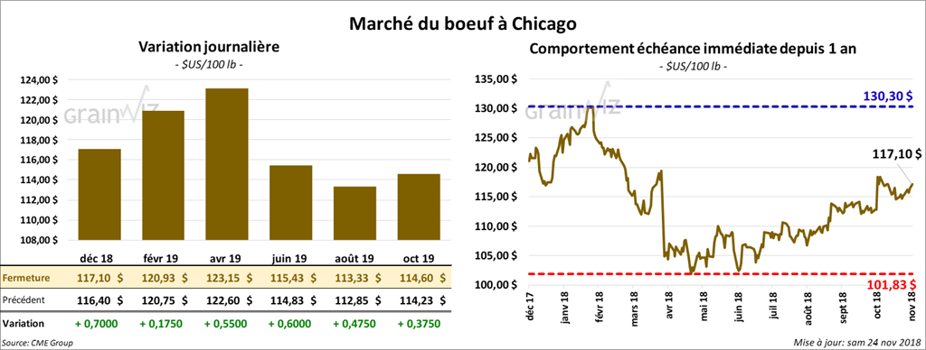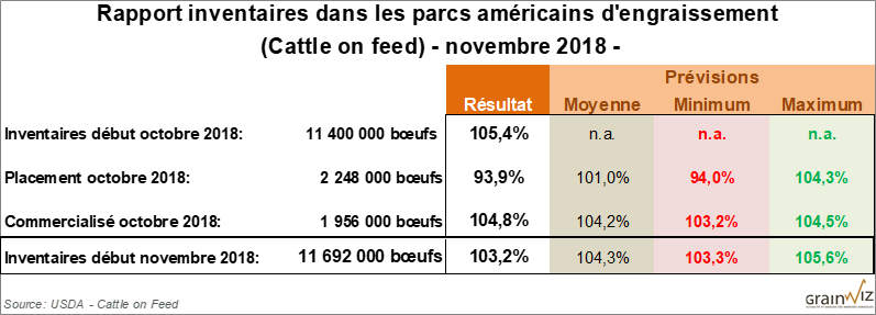Dans son rapport Cattle on Feed, le USDA estimait qu’en date du 1er novembre dernier, 11,692 millions de têtes étaient en inventaires, une augmentation de 3,18 % par rapport à l’an passé à la même période. En Octobre, les placements furent en baisse de 6,06 % comparativement à 2017 à 2,248 millions de têtes, ce qui serait un résultat inférieur aux attentes du marché. Quant à la commercialisation, elle était en hausse de 4,78 % à 1,887 million de têtes.