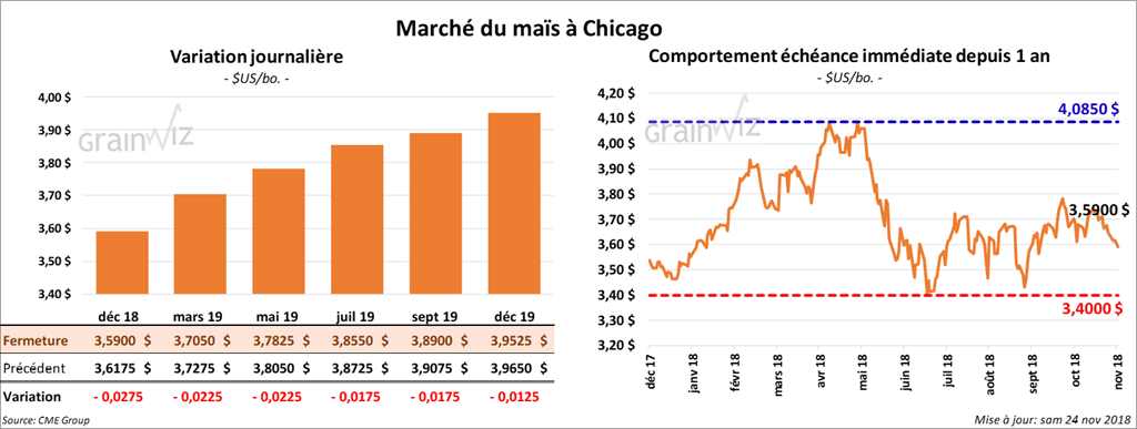 La majorité des contrats de maïs à Chicago ont clôturé en baisse de 1 à 2 ¾ cents. L’option décembre 18 a expiré ce vendredi.