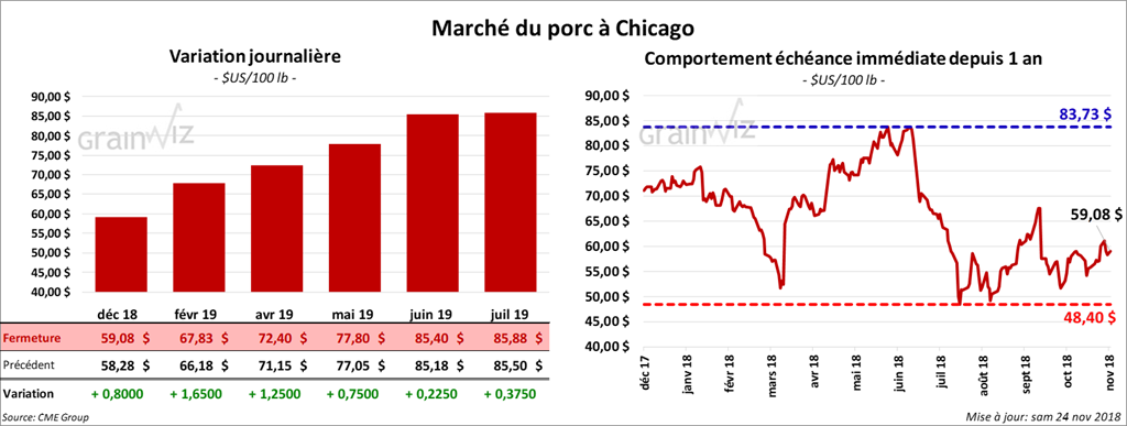 Le 21 novembre dernier, le CME Lean Hog Index était en baisse de 21 cents par rapport au jour précédent à 58,02 $. Cet après-midi, la valeur moyenne des découpes de porc US fut en recul de 4 cents à 66,93 $. Sur une base nationale, le prix moyen au comptant de la carcasse était en baisse de 22 cents à 50,42 $.