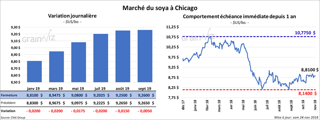 Quant aux ventes à l’exportation de soya US 2018/2019, en date du 15 novembre dernier, elles ont été de 680 528 tonnes, un résultat qui se situe dans le milieu des attentes du marché. Ce serait un haut pour les 7 dernières semaines, mais une baisse de 14,9 % par rapport à la même période l’an dernier. L’Allemagne a été le principal acheteur avec 191 700 tonnes. Toutefois, il y a eu une réduction nette de 290 200 tonnes vers des destinations inconnues et ce, malgré de fortes ventes quotidiennes. Dans le cas des ventes à l’exportation de tourteau de soya, elles ont été de 239 260 tonnes. Celles de l’huile ont atteint 40 045 tonnes.