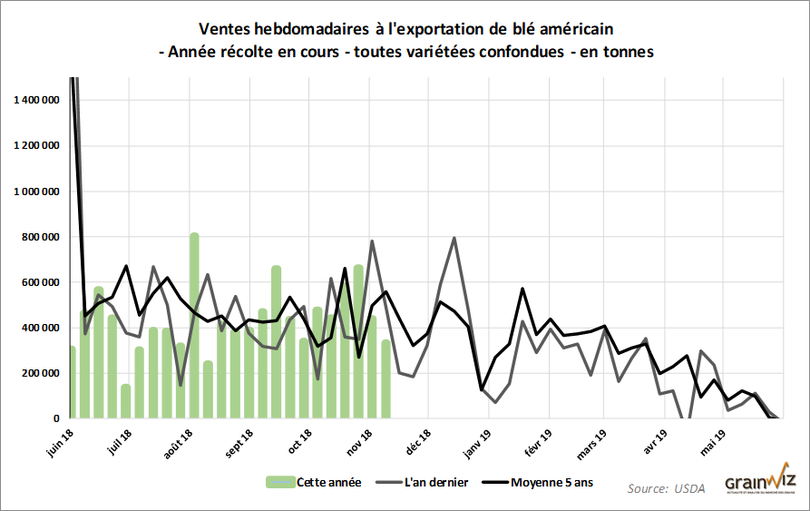 Dans la semaine du 15 novembre dernier, les ventes à l’exportation de tous les types de blé US 2018/2019 ont été de 330 394 tonnes, une baisse de 24,6 % par rapport à la semaine précédente. Il s’agit toutefois d’une augmentation de 65,6 % comparativement à la même période l’an passé. Le Mexique a été le plus gros acheteur avec 112 700 tonnes.