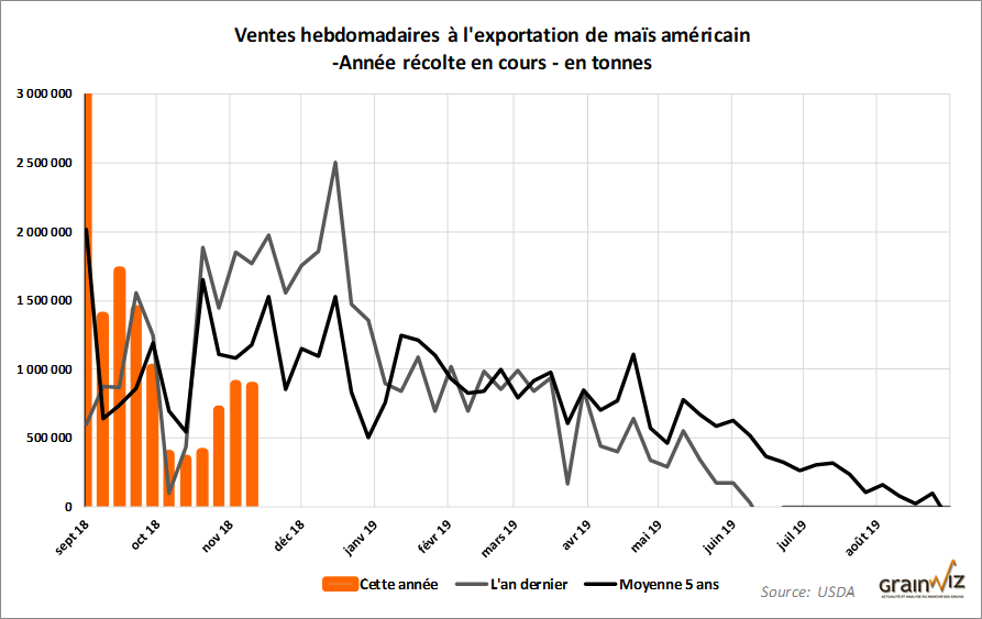 Dans la semaine du 15 novembre dernier, les ventes à l’exportation de maïs US 2018/2019 ont été de 877 424 tonnes, un résultat qui se situe dans la fourchette supérieure des attentes du marché. Il s’agit toutefois d’une baisse de 18,82 % comparativement à la semaine précédente. Le Mexique a acheté 375 900 tonnes de maïs US et le Japon 329 100 tonnes. Il y a eu aussi des réductions nettes de ventes de 181 000 tonnes vers des destinations inconnues.