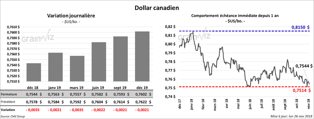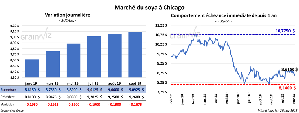 La plupart des contrats de soya à Chicago ont clôturé en baisse de 17 à 18 ¾ cents. Les négociants se montre prudents quant à l’issue de la prochaine rencontre entre le Président Trump et le Président Xi (Chine). Par ailleurs, les contrats de tourteau aux échéances les plus rapprochées ont terminé la session en baisse de 2,80 $/tonnes. L’huile a également perdu 68 points.