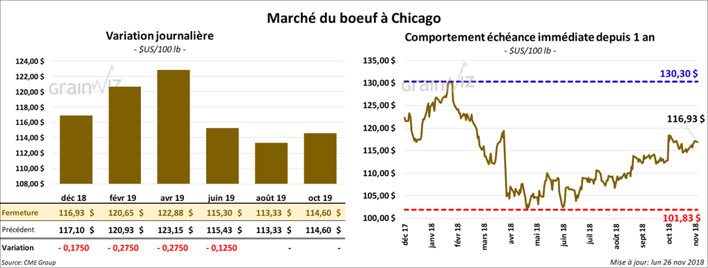 La majorité des contrats de bœuf à Chicago ont terminé la session au neutre à baissier de 27,5 cents. Les contrats de veau ont fini en hausse, mais ceux de janvier ont perdu 22,5 cents.