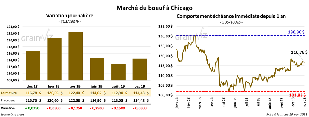La plupart des contrats de bœuf à Chicago ont clôturé au neutre à baissier de 25 cents. Le contrat de décembre 18 était par contre en hausse de 7,5 cents. Les contrats de veau ont également perdu entre 30 et 75 cents.