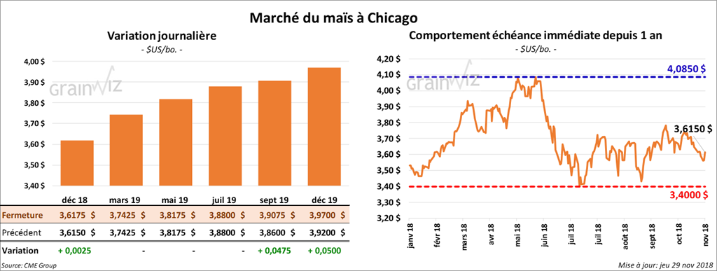Ce mercredi, encouragés par la bonne performance observée dans le secteur du soya et par la faiblesse du dollar US, les contrats de maïs à Chicago ont terminé en hausse de 2 ¾ à 4 ¾ cents.