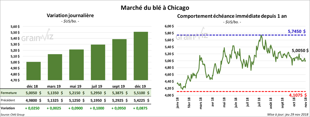 Sous la pression des autres secteurs du grain, la majorité des contrats de blé ont terminé la session en hausse de 1 à 8 ¾ cents. Toutefois, le contrat de décembre 18 était en baisse à Chicago comme à Minneapolis. Le «spread» Chicago/Kansas s’est déroulé sur 9 cents pour totalisé 30 ½ cents.