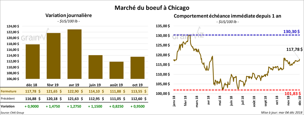 La majorité des contrats de bœuf à Chicago ont terminé la session en hausse de 72,5 cents à 1,475 $. Les contrats de veau ont fait de même en prenant entre 35 et 95 cents. Par contre, le contrat de janvier 19 a perdu 10 cents.