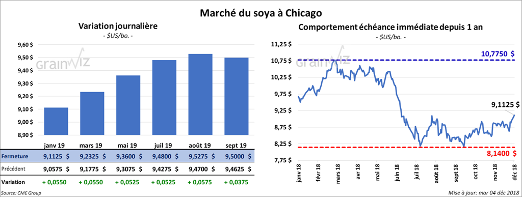 La majorité des contrats de soya à Chicago ont fini en hausse de 5 à 6 ¼ cents. Les contrats de tourteau ont suivi en prenant 60 cents/tonnes. L’huile a gagné 33 points.