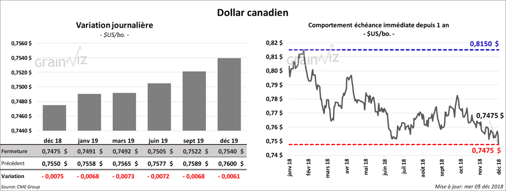 La publication des ventes à l’exportation a été décalée d’une journée et devrait se faire vendredi en raison des funérailles nationales (USA) du Président Bush père. Selon un sondage de Reuters concernant le rapport WASDE de la semaine prochaine, le marché anticipe, pour le soya US 2018/2019, des inventaires de fin d’année à la baisse de 10 millions de boisseaux à un total de 945 millions de boisseaux. Ce résultat pourrait être réel seulement s’il y a des ajustements du côté de la demande. Le USDA attend généralement en janvier pour faire des changements au niveau de ses estimés de production.