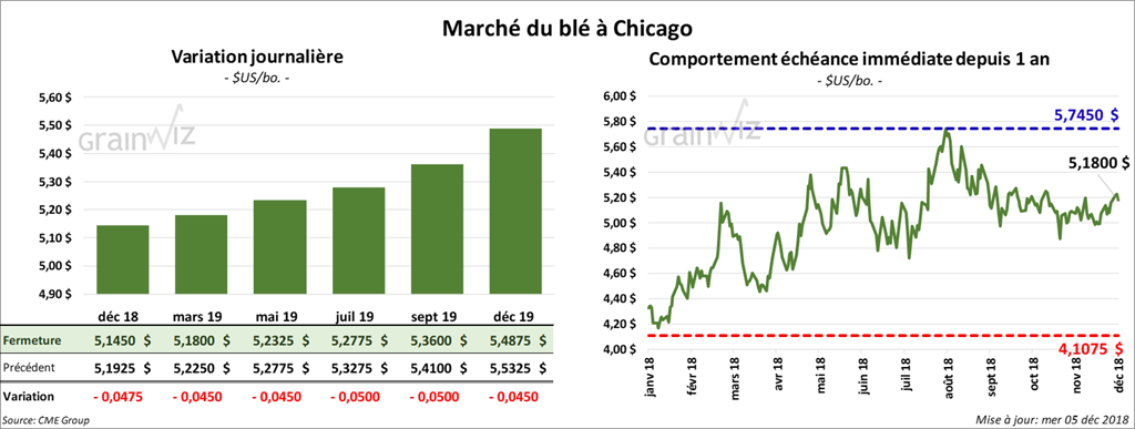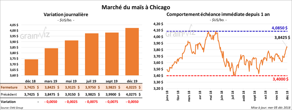 La parution du rapport de l’EIA sur la production hebdomadaire d'éthanol a été reportée à demain en raison des funérailles du président Georges H.W. Bush. Aussi, les nouvelles aujourd’hui sont plutôt limitées. En prévision du rapport mensuel d’offre et de demande qui sera présenté mardi prochain, les analystes s’attendent à des stocks de maïs US 2018/2019 de 1,738 milliard de boisseaux. Il s’agit d’une hausse de seulement 2 millions de boisseaux par rapport à la projection de novembre dernier.