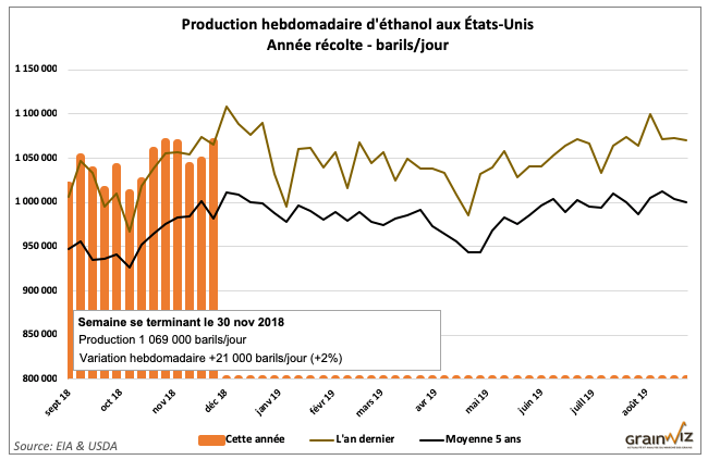 Par ailleurs, EIA estime que dans la dernière semaine de novembre, la production d’éthanol a été de 1,069 million de barils par jour. Ce serait une augmentation de 21,000 bpj par rapport à la semaine précédente. Quant aux stocks, ils étaient en hausse de 100,000 barils à 23,030 millions de barils.