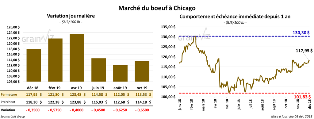 La plupart des contrats de bœuf à Chicago ont terminé la session avec des baisses de 35 à 65 cents. Les contrats de veau ont pris la même direction en reculant de 35 cents à 1,35 $.